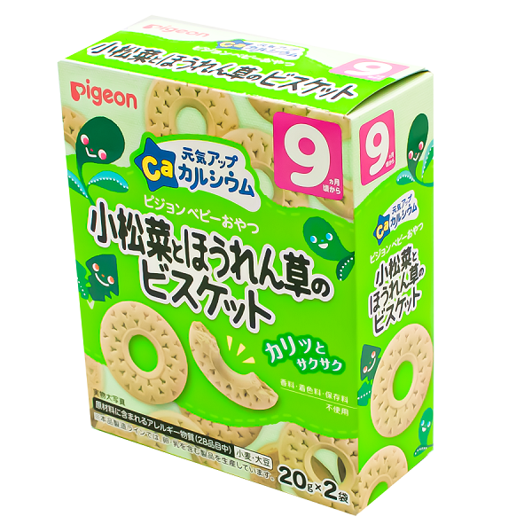 Bánh Ăn Dặm Pigeon Vị Rau Bina Cho Bé 9 Tháng cung cấp canxi cho bé từ 9 tháng tuổi.
