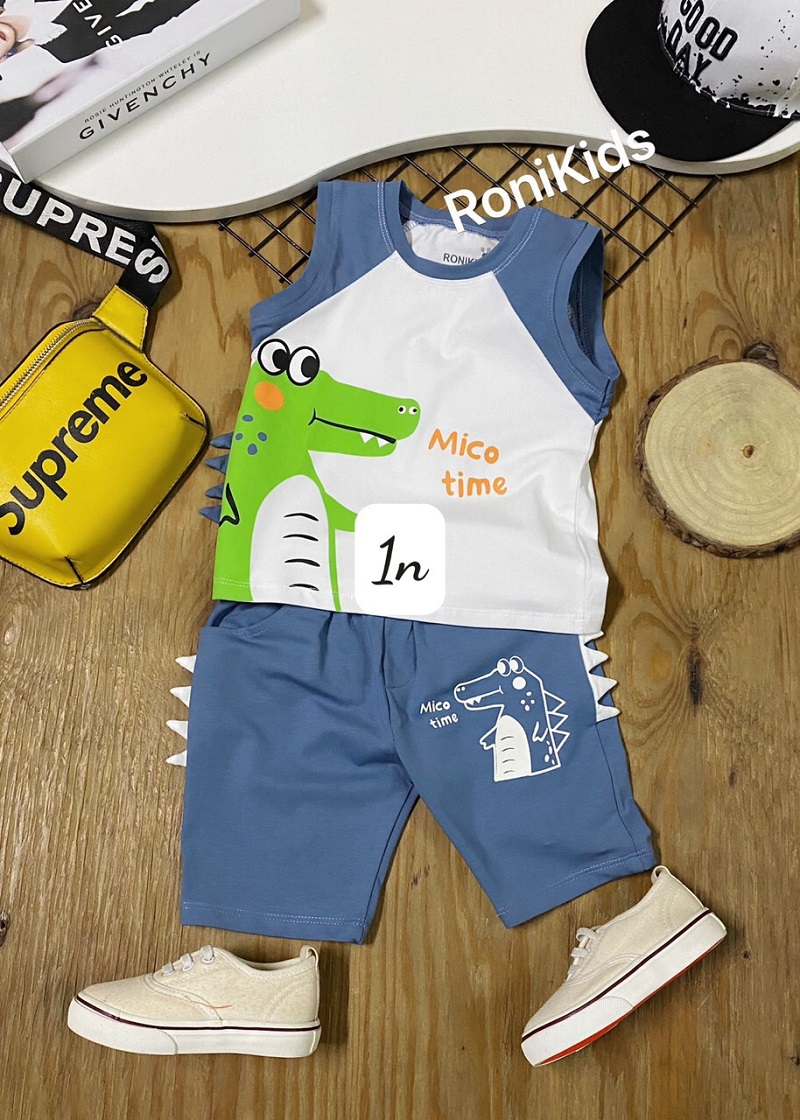 Nguyên bộ may bằng chất thun cotton 4c mềm mịn, in sắc nét, bên sườn đính vây. Quần lửng có túi, đính vây bên sườn túi rất đáng yêu.
