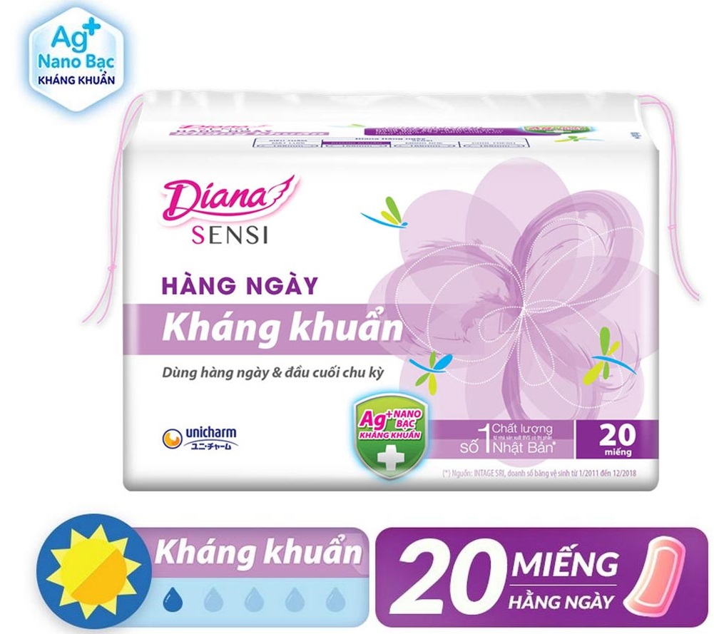 Băng Vệ Sinh Diana Sensi Kháng Khuẩn Hàng Ngày là dòng sản phẩm băng vệ sinh không cánh đến từ thương hiệu Diana thuộc tập đoàn Unicharm Nhật Bản, được thiết kế dành cho mục đích sử dụng hàng ngày hoặc ngày đầu / ngày cuối của chu kỳ. Sản phẩm có bề mặt bông mềm mại, siêu mỏng nhẹ, cho cảm giác êm mềm tối đa "tựa như không". Đặc biệt, công nghệ vi sợi độc đáo siêu thấm hút giúp bạn luôn sạch sẽ và thoải mái mỗi ngày, cùng thiết kế vừa vặn và ôm sát giúp bạn tự tin trong mọi hoạt động.
