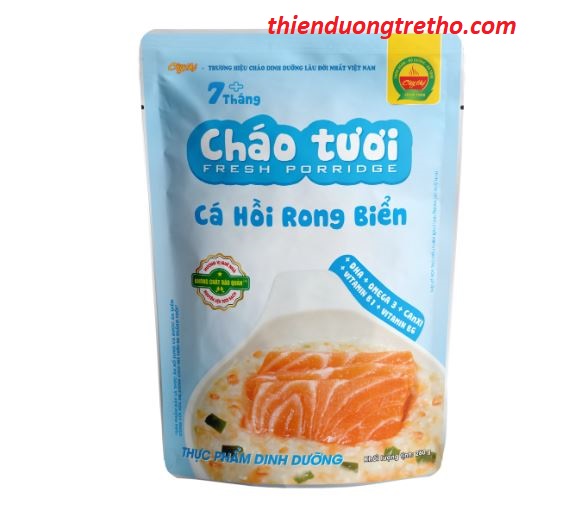 - Cháo cây thị vị cá hồi được chế biến từ các nguyên liệu tươi ngon mang đến cho bé yêu đầy đủ dinh dưỡng, đảm bảo súc khỏe cho bé.