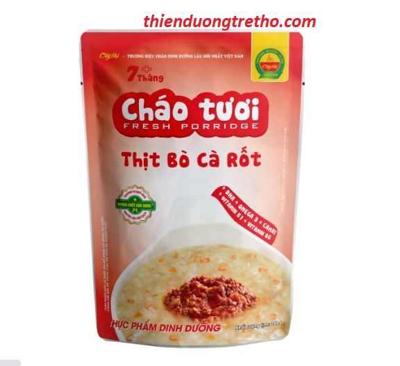 Cháo tươi thịt bò cà rốt được chế biến từ thịt bò tươi cung cấp nhiều đạm, giàu sắt bồi bổ cơ thể kết hợp cung cà rốt cung cấp hàm lượng chất xơ cho bé.