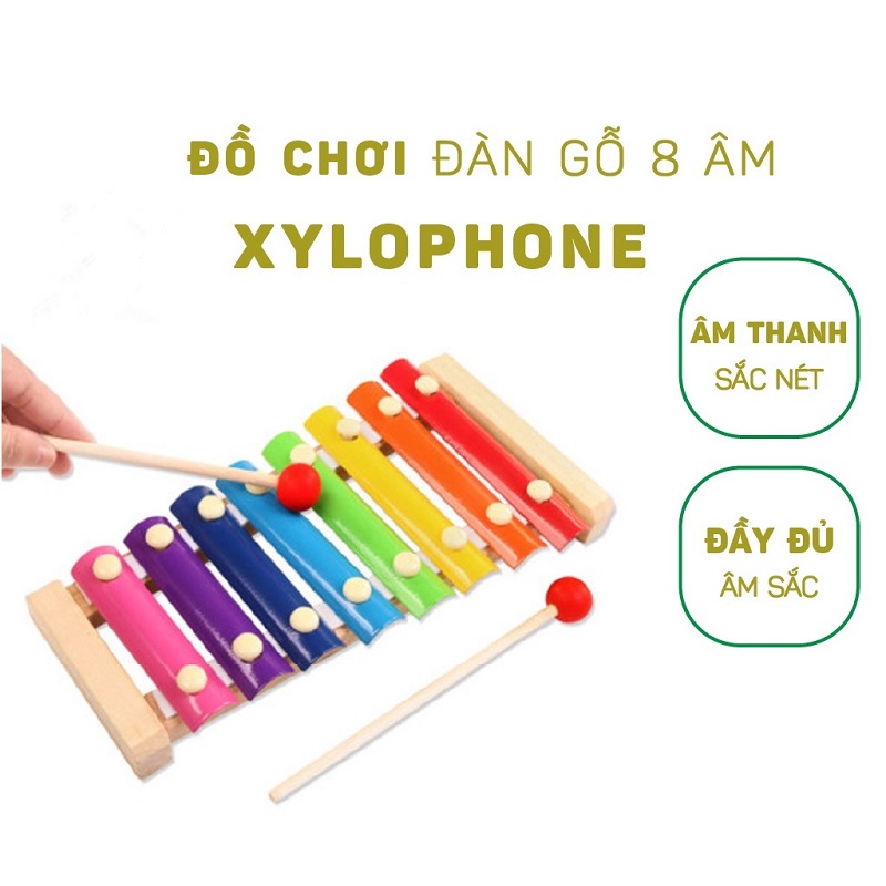 Chiếc đàn gỗ đáng yêu và độc đáo có 8 thanh kim loại kích cỡ khác nhau, 8 màu khác nhau giúp cho con học màu, kích thích thính giác, sự chính xác khi con gõ các phím đà đàn được làm bằng hợp kim có âm thanh rõ ràng giai điệu du dương.