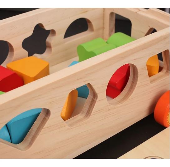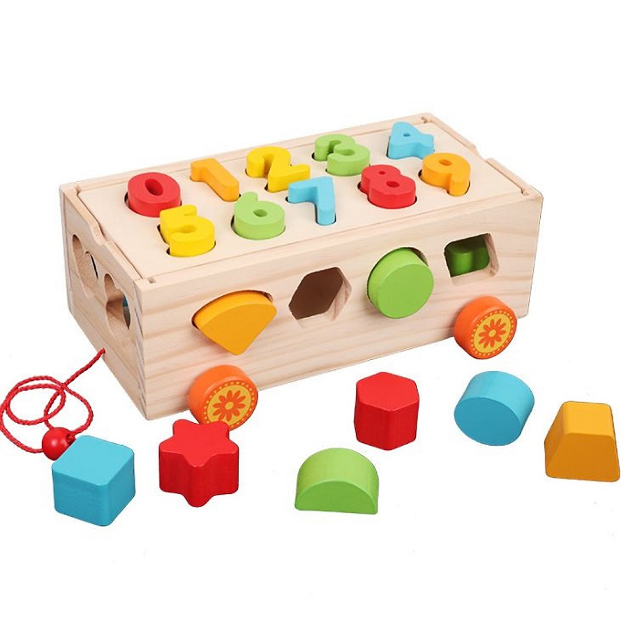 - Bộ đồ chơi xe kéo thả số và hình khối giúp bé dễ dàng nhận biết, sự giống và khác nhau giữa các hình khối, màu sắc.