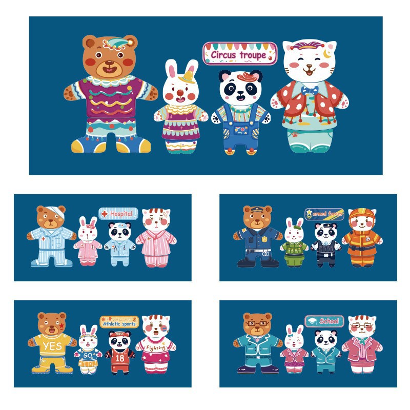 - Mỗi hộp gồm 5 chủ đề cho bé tìm hiểu thế giới xung quanh: Rạp xiếc, trường học, bệnh viện, thể thao, bảo vệ