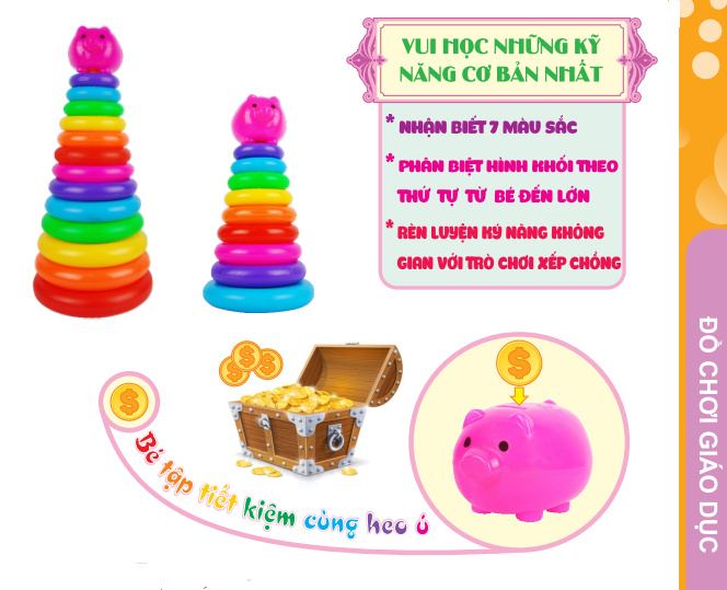 - Xếp vòng mầm non – có thêm một em heo hồng dễ thương để các bé chơi cùng với vòng ngoài ra còn có thể để làm heo tiết kiệm rất thú vị.