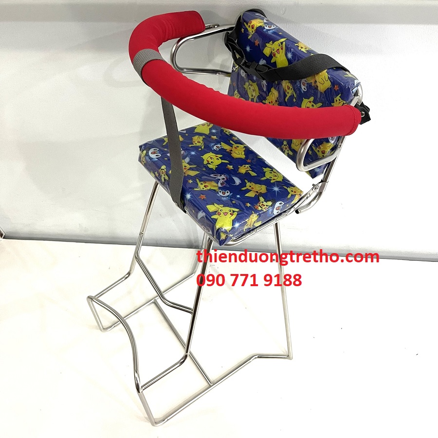 - Chất liệu: Khung làm inox không gỉ, đệm ngồi êm ái, giúp bé thoải mái khi ngồi lâu.