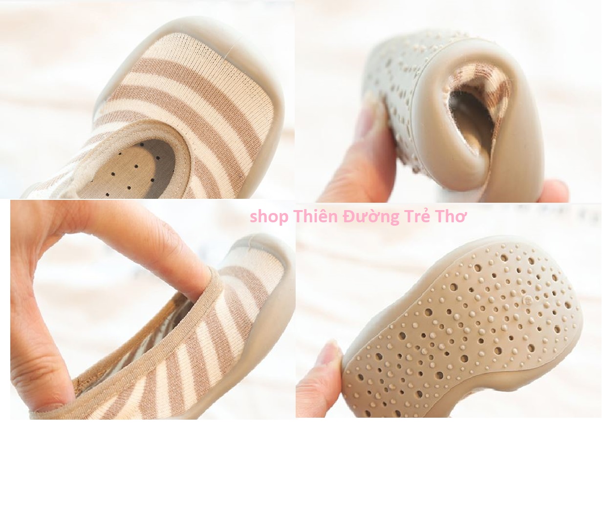 - Giày được thiết kế bằng vải mềm, co giãn ôm gọn chân bé, đế giày bằng silicon mềm dẻo êm ái nâng niu bàn chân bé.