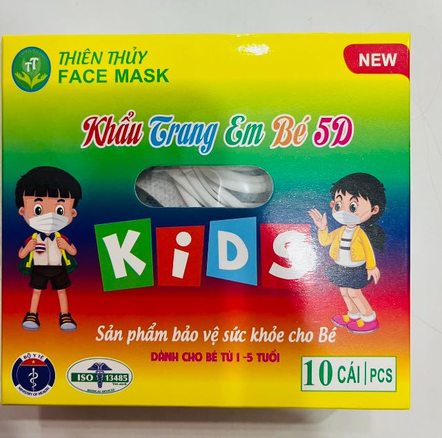 Khẩu trang Em Bé 5D Thiên Thủy được làm từ vải không dệt Polypropylene, có tác dụng lọc bụi, kháng khuẩn và ngừa virus lây nhiễm, thiết kế phù hợp ôm sát mặt bé nhưng không hề khó thở và khó chịu phần mũi