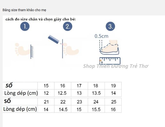 (công thức là: chân bé + 0.5 rồi chọn size có chiều dài lòng trong tương ứng)