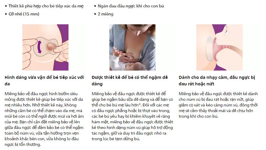 Miếng bảo vệ đầu ngực được thiết kế để giúp bé ngậm bầu sữa dễ dàng và để mẹ có thể cho bé bú mẹ lâu hơn. Đối với các mẹ có đầu ngực phẳng hoặc bị thụt vào trong, các bé bú yếu hay bị khiếm khuyết về răng hàm mặt, miếng bảo vệ đầu ngực được thiết kế theo hình dạng núm vú giúp hỗ trợ động tác ngậm, giữ và duy trì đầu ngực nhô ra trong lúc bé tạm dừng bú.