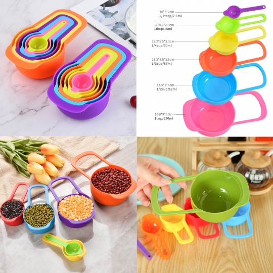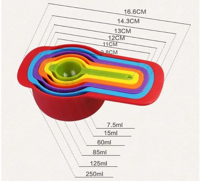Bộ thìa đong màu sắc gồm 6 chiếc với tỉ lệ lần lượt là: 250ml , 125ml , 85ml , 60ml , 15ml , 7,5ml