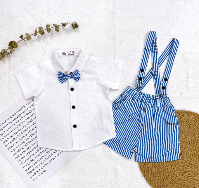 Chất liệu: sơ mi (kate thun mềm co giãn), quần đùi kaki kết hợp quai đeo chéo