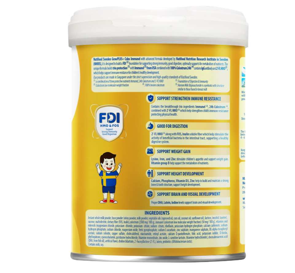 - Nutifood GrowPLUS+ Immunel là sản phẩm sữa bột với công thức đột phá, phát triển bởi Nutifood Thụy Điển, đặc biệt phù hợp với thể trạng của trẻ em Việt Nam. Công thức này được xây dựng trên nền tảng FDI, giúp hỗ trợ đề kháng khỏe, tiêu hóa tốt, và tối ưu hóa dinh dưỡng