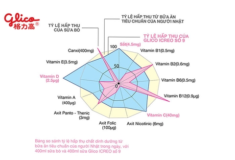So sánh với việc uống sữa bò, tỉ lệ dưỡng chất trẻ có thể hấp thu khi uống sữa Glico số 1 cao hơn đáng kể và tuân thủ tiêu chuẩn dinh dưỡng khắt khe của Nhật Bản.