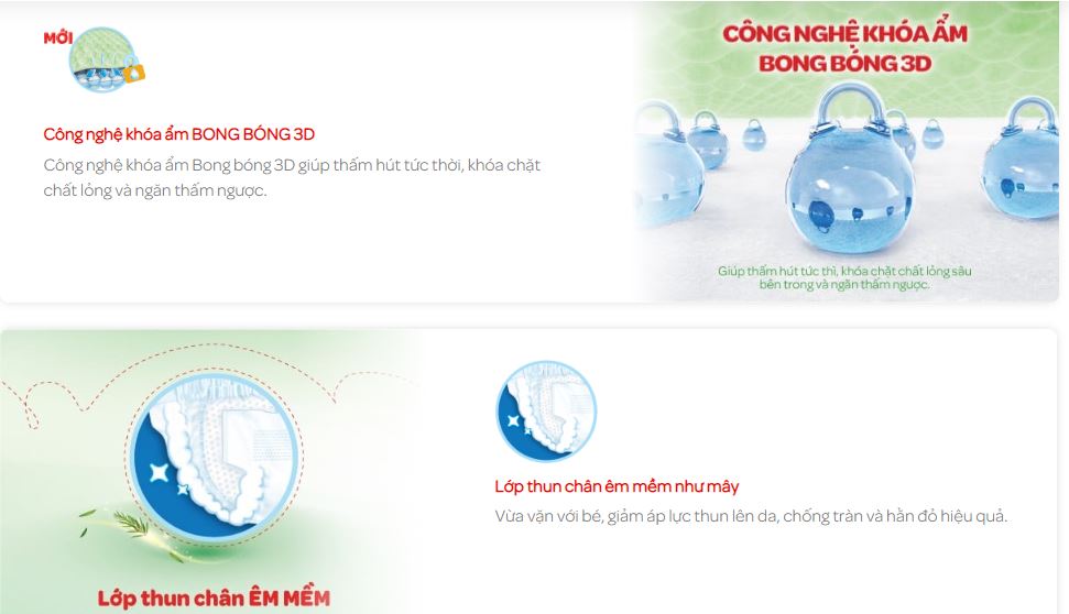 * 99,9% NGĂN THẤM NGƯỢC (1) - Công nghệ khóa ẩm BONG BÓNG 3D giúp thấm hút tức thời, khóa chặt chất lỏng sâu bên trong và ngăn thấm ngược.
