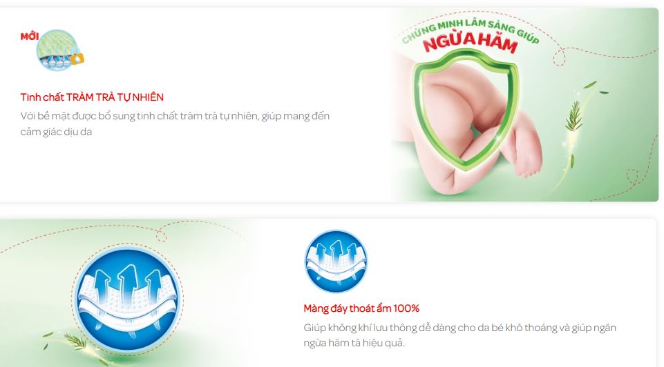* Khả năng thoáng khí được chứng minh lâm sàng giúp NGỪA HĂM TÃ, nhờ công nghệ Màng đáy thoát ẩm 100% giúp không khí lưu thông dễ dàng, cho da bé luôn được khô thoáng dài lâu.