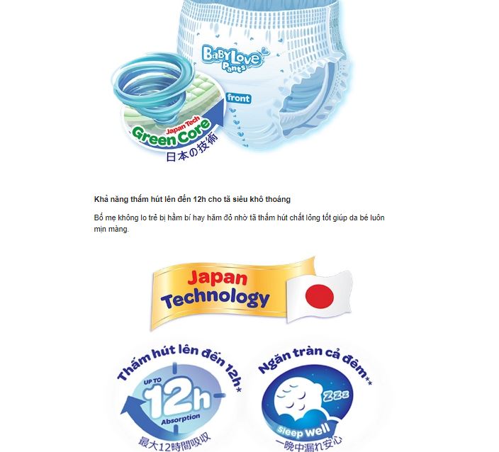 Tã BabyLove với 3 tầng bảo vệ được ứng dụng công nghệ mới Japan Tech GreenCore vào quá trình sản xuất.