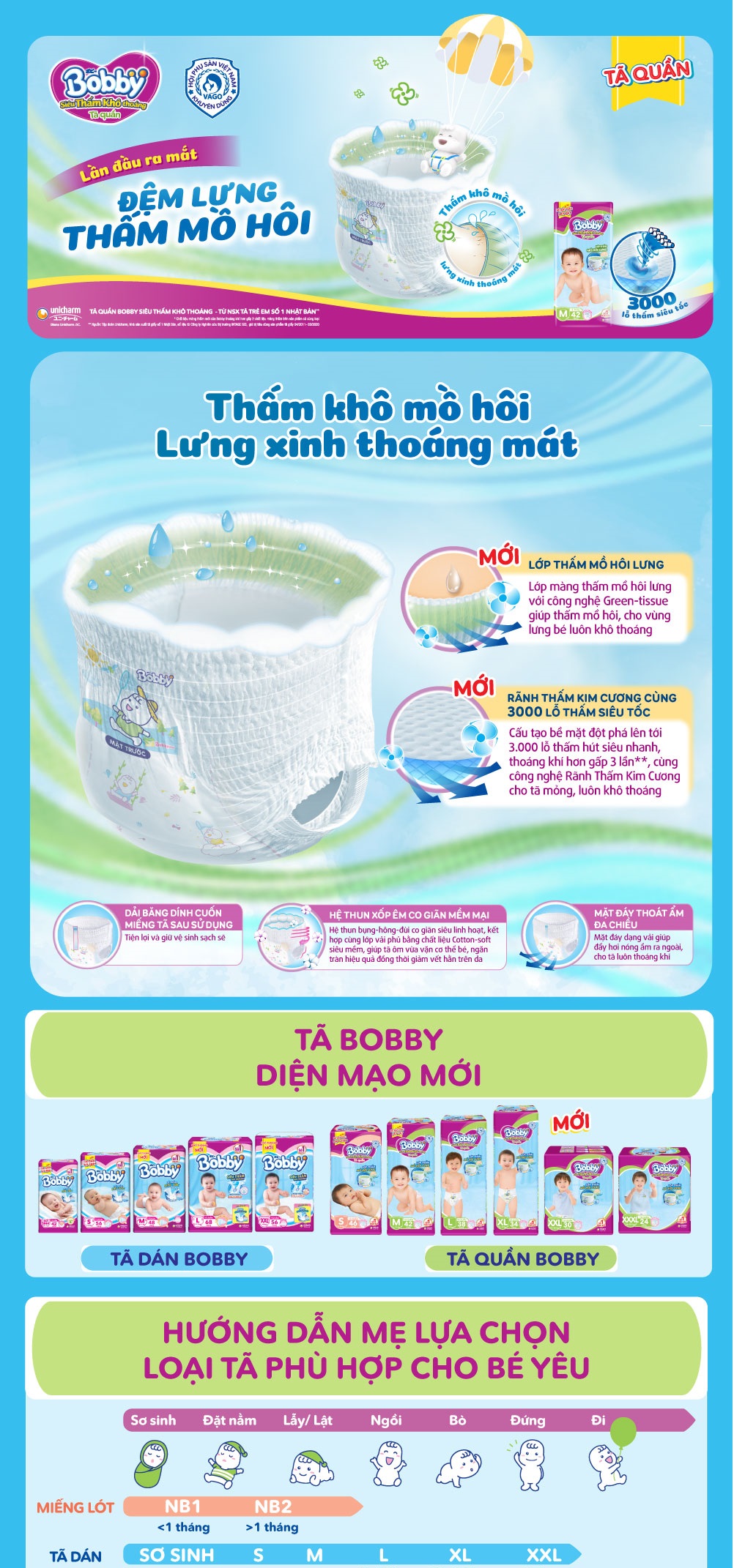 Tã Quần Bobby Size XXL 56 Miếng Mẫu Mới Đệm Lưng Thấm Mồ Hôi Cho Bé >16 kg