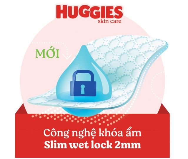 Nếu mẹ đang băn khoăn liệu một chiếc tã 2mm có thấm hút tốt không thì mẹ hãy yên tâm nhé! Lõi tã Huggies được thiết kế đặc biệt với khả năng khóa ẩm tức thì, giúp khóa chặt chất lỏng sâu bên trong và ngăn trào ngược, đồng thời duy trì da bé luôn khô thoáng.