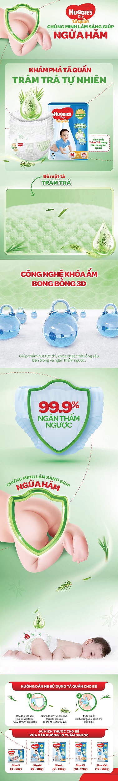 Tã quần Huggies MỚI – với bề mặt được bổ sung tinh chất TRÀM TRÀ TỰ NHIÊN, giúp mang đến cảm giác dịu da.