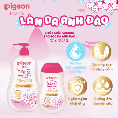 Với chiết xuất từ những cánh hoa anh đào – biểu tượng đặc trưng của Nhật Bản, Sữa tắm gội Sakura là sự kết hợp giữa tinh chất anh đào thơm mát, và vitamin B5 giúp giữ ẩm tuyệt đối.Sản phẩm dành cho trẻ sơ sinh và trẻ nhỏ Sữa tắm gội Pigeon với công thức đến từ Nhật Bản giúp nhẹ nhàng làm sạch, nuôi dưỡng tóc và làn da mỏng manh của bé trở nên khỏe mạnh và mịn màng