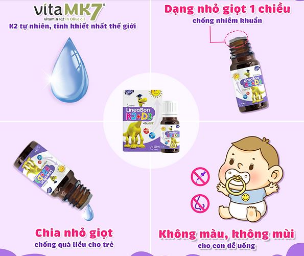 LineaBon là dạng D3 K2 đầu tiên tại Việt Nam và là sản phẩm chứa thành phần K2 thế hệ mới vitaMK7. Đây là dạng K2 có độ tinh khiết lên đến 97,8%, đem lại khả năng hấp thu canxi gấp đôi so với D3K2 thông thường ở đạng tổng hợp, hiệu quả hấp thu lên tới 99% thích hợp cho cả những trẻ có cơ địa khó hấp thu canxi.