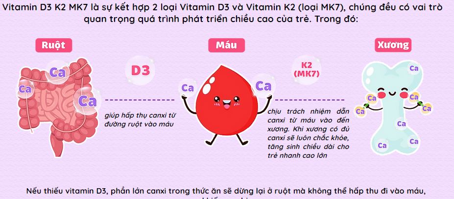 Vitamin K2+D3 có vai trò rất to lớn cho quá trình phát triển của trẻ. Vitamin D3 giúp canxi hấp thụ từ thành ruột vào máu. Còn K2 là vi chất kích hoạt protein vận chuyển canxi gắn trực tiếp vào xương. K2 cũng là dưỡng chất đóng vai trò quan trọng hỗ trợ cải thiện mật độ xương, tăng độ chắc khỏe.