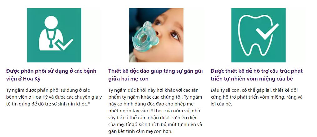 Ty ngậm đúc khối này hơi khác với các sản phẩm ty ngậm khác của Philips Avent. Ty ngậm này có hình dáng độc đáo cho phép mẹ nhét ngón tay vào lõi bọc của núm vú, nhờ vậy bé có thể cảm nhận được sự hiện diện của mẹ, từ đó kích thích bú mút tự nhiên và gắn kết tình cảm mẹ con hơn.