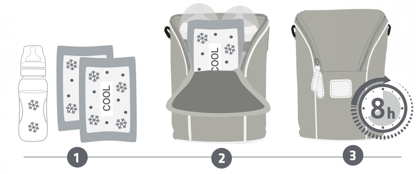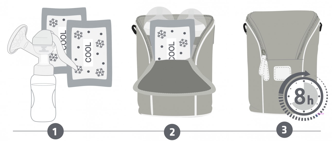 GIỮ LẠNH: sử dụng với sữa đóng đá trong trủ đông, khi mà mẹ và bé chuẩn bị cho 1 chuyến đi xa. Sữa mẹ sẽ được bảo quản trong 8 giờ đồng hồ.'