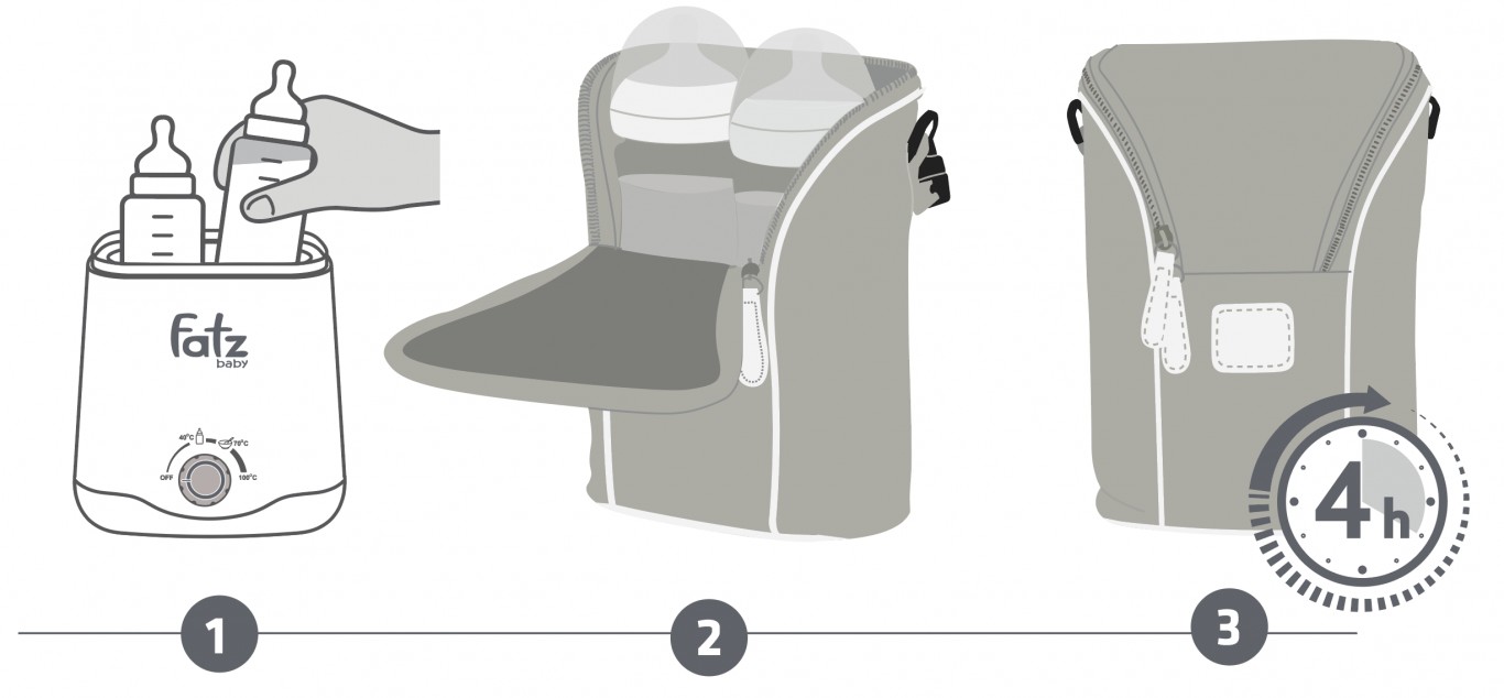 - Cài khoá túi. Sữa sẽ được bảo quản ấm trong túi trong khoảng 3-4 đồng hồ.
