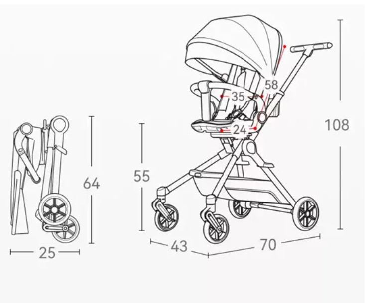 Xe đẩy du dịch đảo chiều gấp gọn; có tư thế nằm, ngả, ngồi |